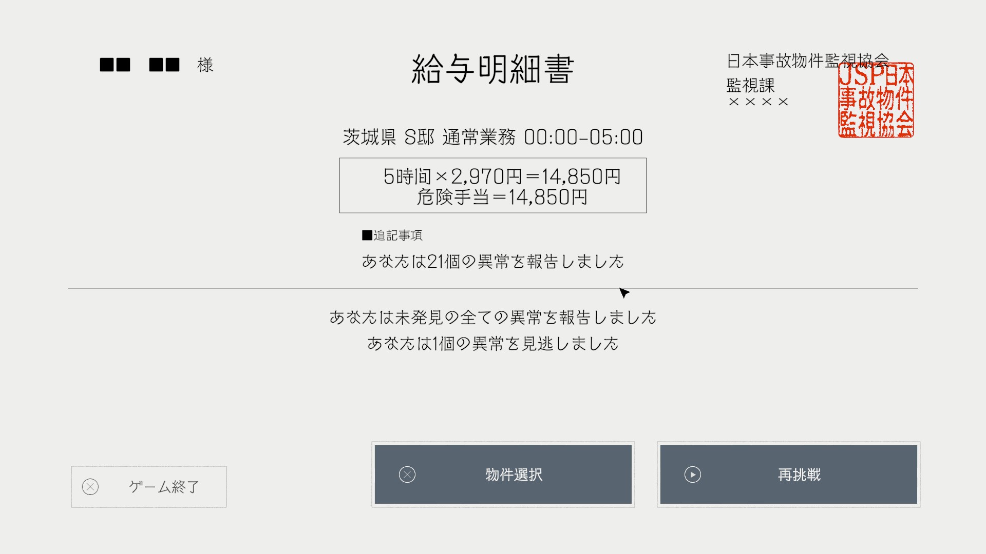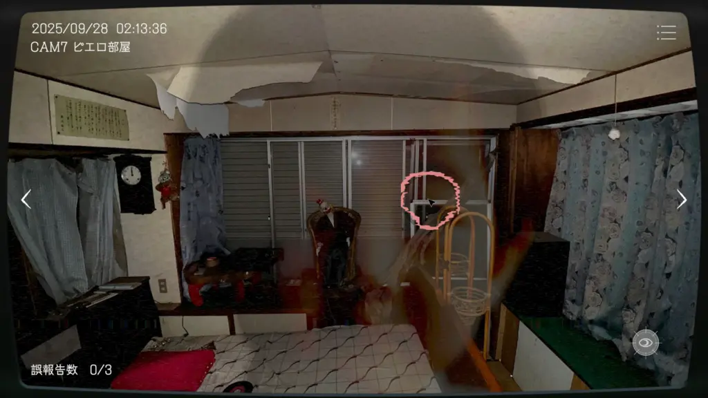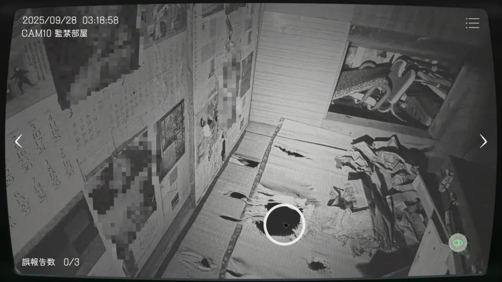 『日本事故物件監視協会』の、茨城県 S邸(危険手当)には92個の異常があります。その異常一覧を記載します。危険手当では、新たに「CAM10 監禁部屋」が02:30:00以降から追加されます。初回はカメラが砂嵐になるためすぐにカメラが追加されたことに気付きますが、2回目以降は砂嵐は発生しないです。