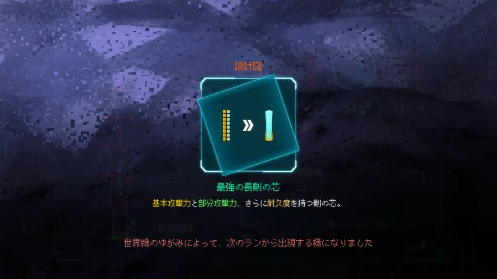 最強の長剣の芯を作ると手に入ります。最強の長剣の芯の設計図はカルマ2380で手に入ります。